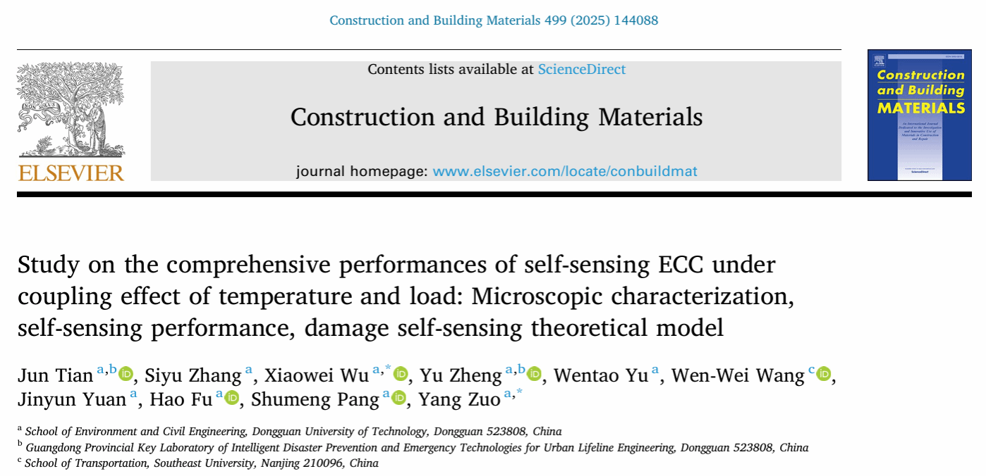 近日,田俊特聘教授、郑愚副校长、袁锦昀院士等人在工程技术领域TOP期刊《Construction and Building Materials》发表了题为Study on the comprehensive performances of self-sensing ECC under coupling effect of temperature and load: Microscopic characterization, self-sensing performance, damage self-sensing theoretical model的研究论文。我校田俊特聘教授为论文的第一作者,硕士研究生章思宇为论文的第二作者,...